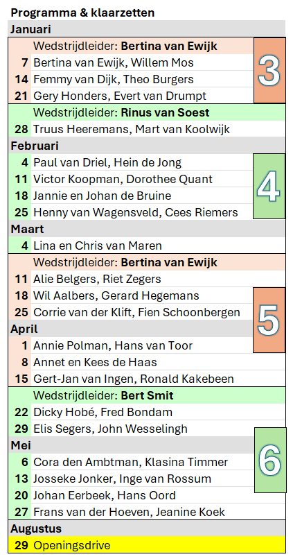 Elke speelavond is er een aantal leden dat helpt met de voorbereiding: bidding boxen, tafelnummering en bijbehorende spellen over de speeltafels verdelen. Voor de komende tijd ziet de planning er als volgt uit: